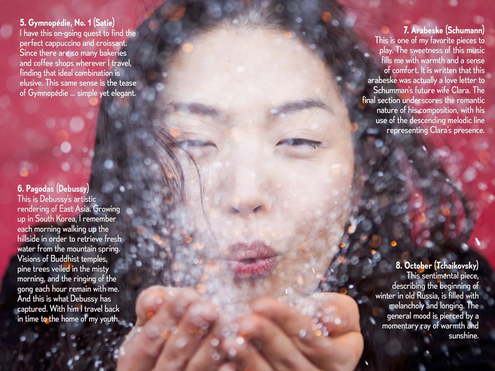 This is Debussy’s artistic rendering of East Asia. Growing up in South Korea, I remember each morning walking up the hillside in order to retrieve fresh water from the mountain spring. Visions of Buddhist temples, pine trees veiled in the misty morning, and the ringing of the gong each hour remain with me. And this is what Debussy has captured. With him I travel back in time to the home of my youth.