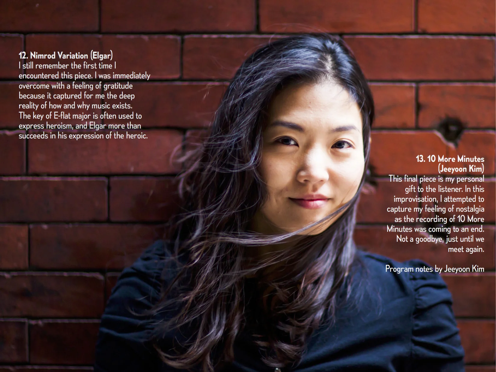 13. 10 More Minutes (Jeeyoon Kim) This final piece is my personal gift to the listener. In this improvisation, I attempted to capture my feeling of nostalgia as the recording of 10 More Minutes was coming to an end. Not a goodbye, just until we meet again.